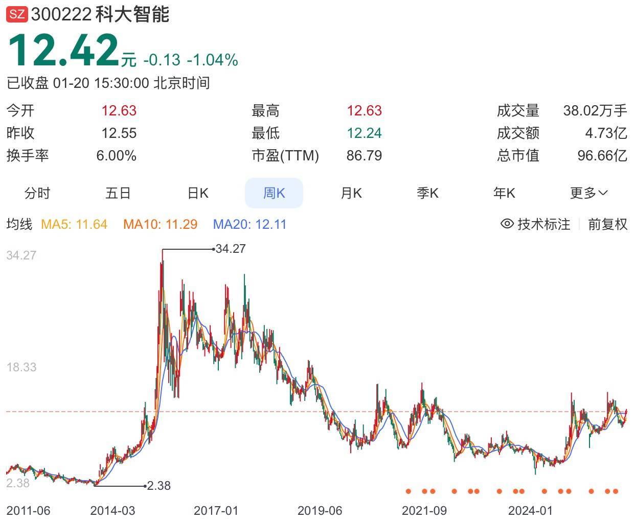 作为已在A股上市的科大智能,当前的市值表现承压。截至1月20日收盘,公司股价报12.42元,总市值96.66亿元。相较于历史最高点34.27元,公司股价已累计回撤63.76%。若此次港股上市成功,科大智能将构建起“A+H”双融资平台。