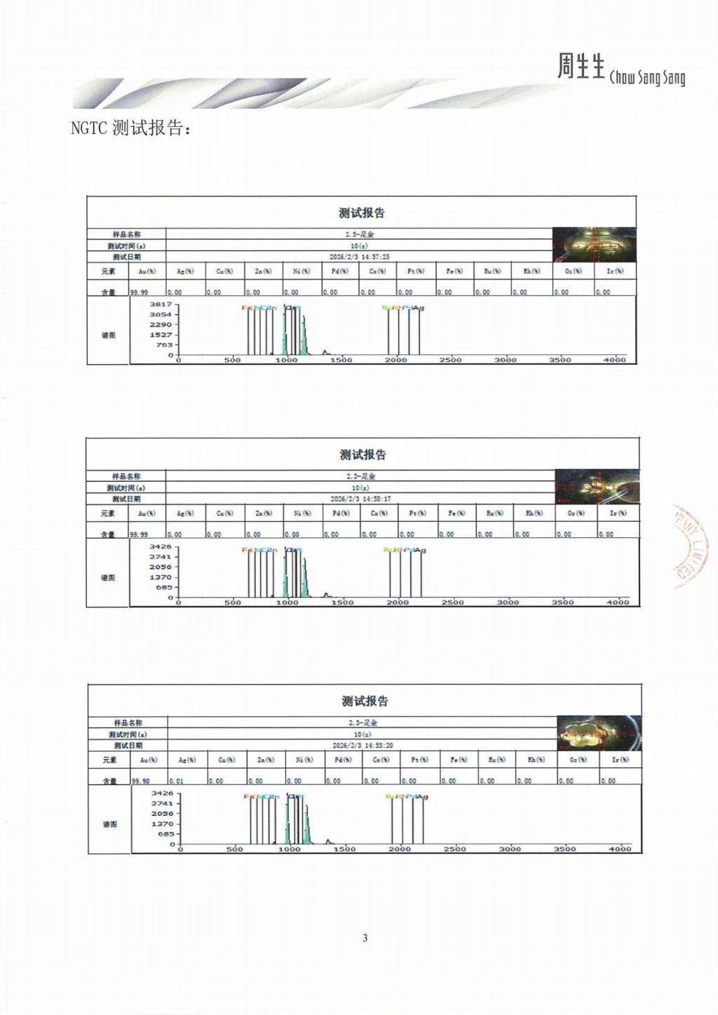 同时,今日2月3日,我司已将同批次同款福袋送检至国家珠宝玉石首饰检验集团有限公司(NGTC),采用X射线荧光光谱法(XRF)进行检测,该福袋货品的检测结论为足金饰品(报告编号:P-ZSSA2121621)。NGTC对该货品随机选取3个检测点,检测所得金含量结果依次为99.99%、99.99%、99.98%(详见附件)。