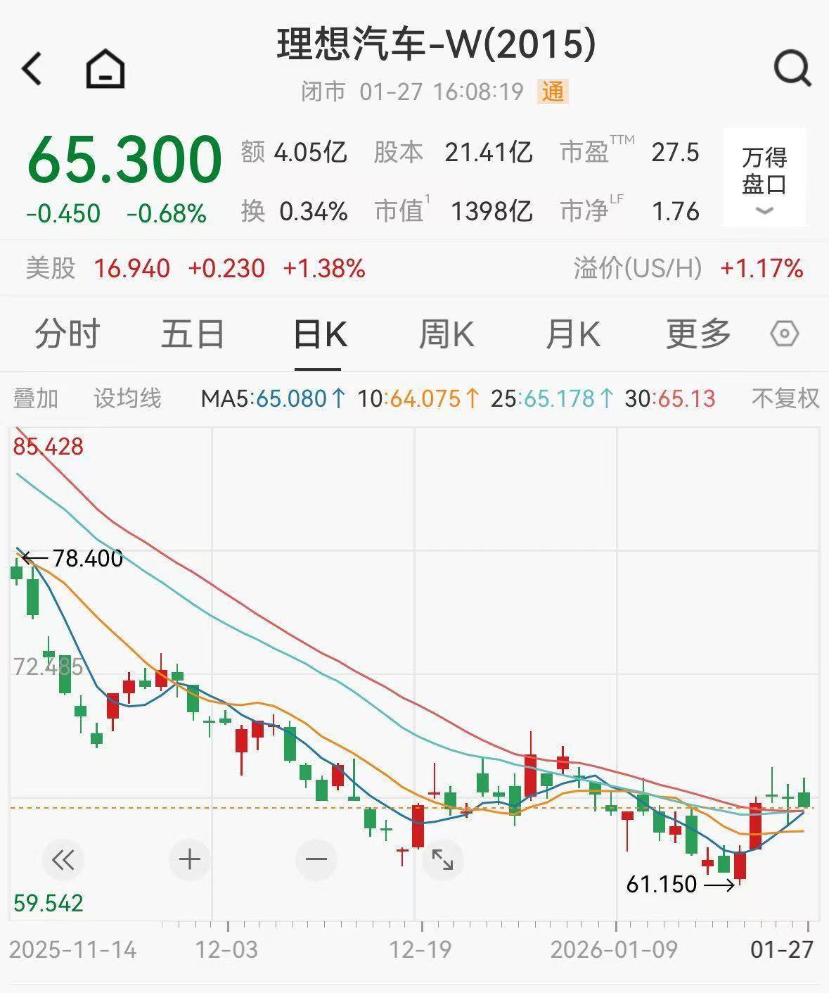 1月27日,理想汽车港股跌0.68%,报收65.3港元/股,总市值为1398亿港元,年内股价微涨0.69%。