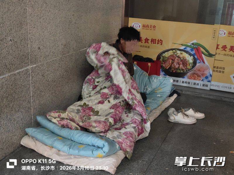 3月16日夜,长沙火车站广场气温骤降,街头行人寥寥。长沙火车站地区综合事务中心的工作人员、广州利富蜗牛公益服务中心社工周松山在例行巡查时,发现一名中年男子正在翻找垃圾箱。他衣着单薄,神情恍惚,显得格外落寞。
