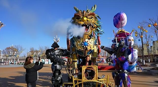 最引人注目的,当属园区全新推出的机甲麒麟巡游表演。这尊高达3米、身披机械铠甲的麒麟巨兽,脱胎于《诗经》中“仁兽”的形象,却以红眼激光、蒸汽龙息等科技元素焕新登场。据工作人员介绍,麒麟在中国传统文化中象征“镇宅、招财、旺业、送子”,园区巧妙地将这些美好寓意融入现代巡游表演中——红眼亮起寓意驱散晦气,龙息喷薄代表迎新纳福。